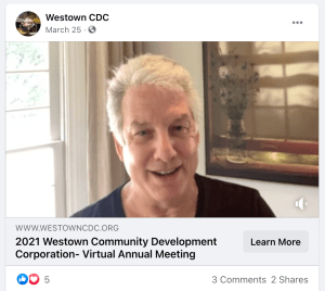 The team produced a pre-recorded video for Westown Community Development Corporation’s 2021 Annual Meeting, which was live-streamed to Facebook.